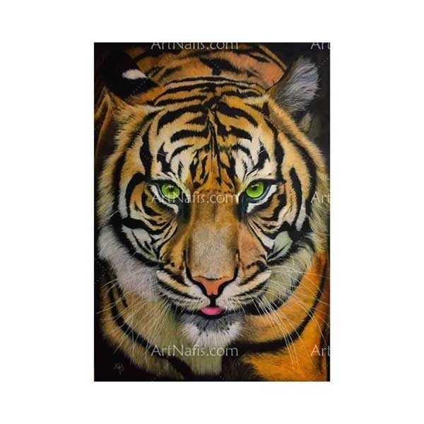 Tier zu malen ist für die meisten Menschen mit vielen starken Emotionen verbunden. Bei einem Tiegerfell sind zarte und weiche Übergänge ganz wichtig. Zuerst habe ich eine dünne Schicht als Grundfarbe gemalt, dann habe ich die nächsten Schichten mit einem sehr dünnen Pinsel übereinander aufgetragen. So habe ich einen imposanten 3-D Effekt erzielt. Refrenzfoto von Gröschl.