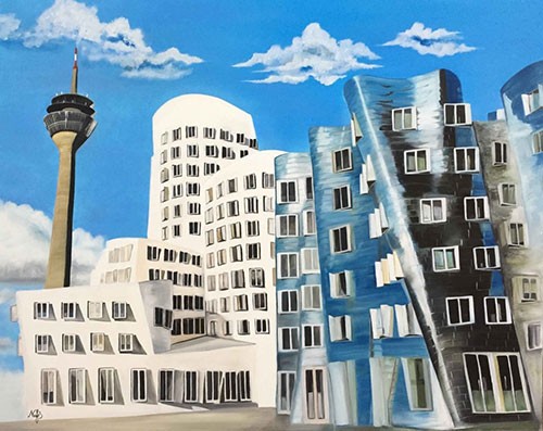Die Gehry-Bauten sind das moderne Wahrzeichen Düsseldorfs. Gemeinsam zählen sie über 1.500 Fenster. Ihre Fassaden sind krumm, wirken in sich verschachtelt und sind so unterschiedlich gestaltet, dass die Häuser auf den ersten Blick gar nicht richtig zusammenpassen. Dieses Gemälde, das mit Ölfarbe geschaffen wurde, dauerte etwa einen Monat. Nachdem die erste Schicht getrocknet war, wurden die zweite und dritte Schicht aufgetragen.