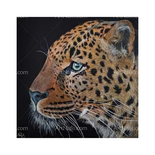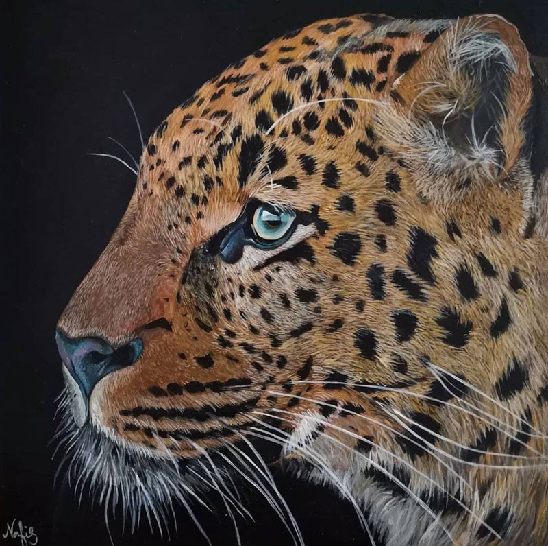 Dieses originalle Bild ist mit Acryl auf Tafel gemalt. Bei einem Tierfell sind zarte und weiche Übergänge ganz wichtig. Zuerst habe ich eine dünne Schicht als Grundfarbe gemalt, dann habe ich die nächsten Schichten mit einem sehr dünnen Pinsel übereinander aufgetragen. Refrenzfoto von Tambako.