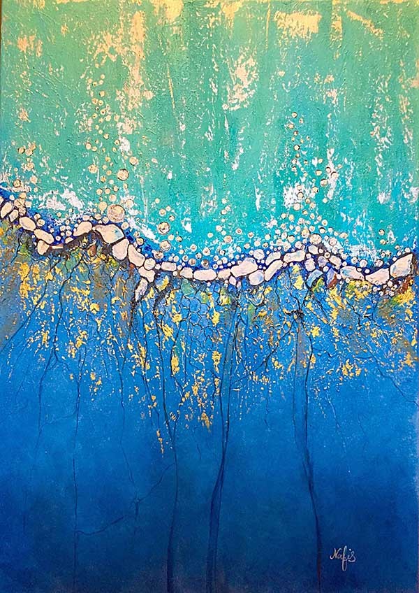 Je nach Verwendungszweck können wir die Paste nutzen, um die Oberfläche durchgehend zu glätten oder bewusst raue Strukturen aufzutragen. Nachdem das erwünschte Relief aufgetragen ist, gilt erstmal zu warten, denn die Paste trocknet langsam. Danach tragen wir die Acrylfarbe auf das Relief auf.
