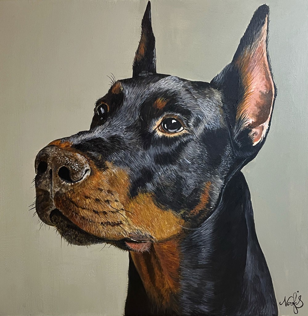 Tier zu malen ist für die meisten Menschen mit vielen starken Emotionen verbunden. Bei einem Tiegerfell sind zarte und weiche Übergänge ganz wichtig. Zuerst habe ich eine dünne Schicht als Grundfarbe gemalt, dann habe ich die nächsten Schichten mit einem sehr dünnen Pinsel übereinander aufgetragen. So habe ich einen imposanten 3-D Effekt erzielt. Refrenzfoto von Gröschl.