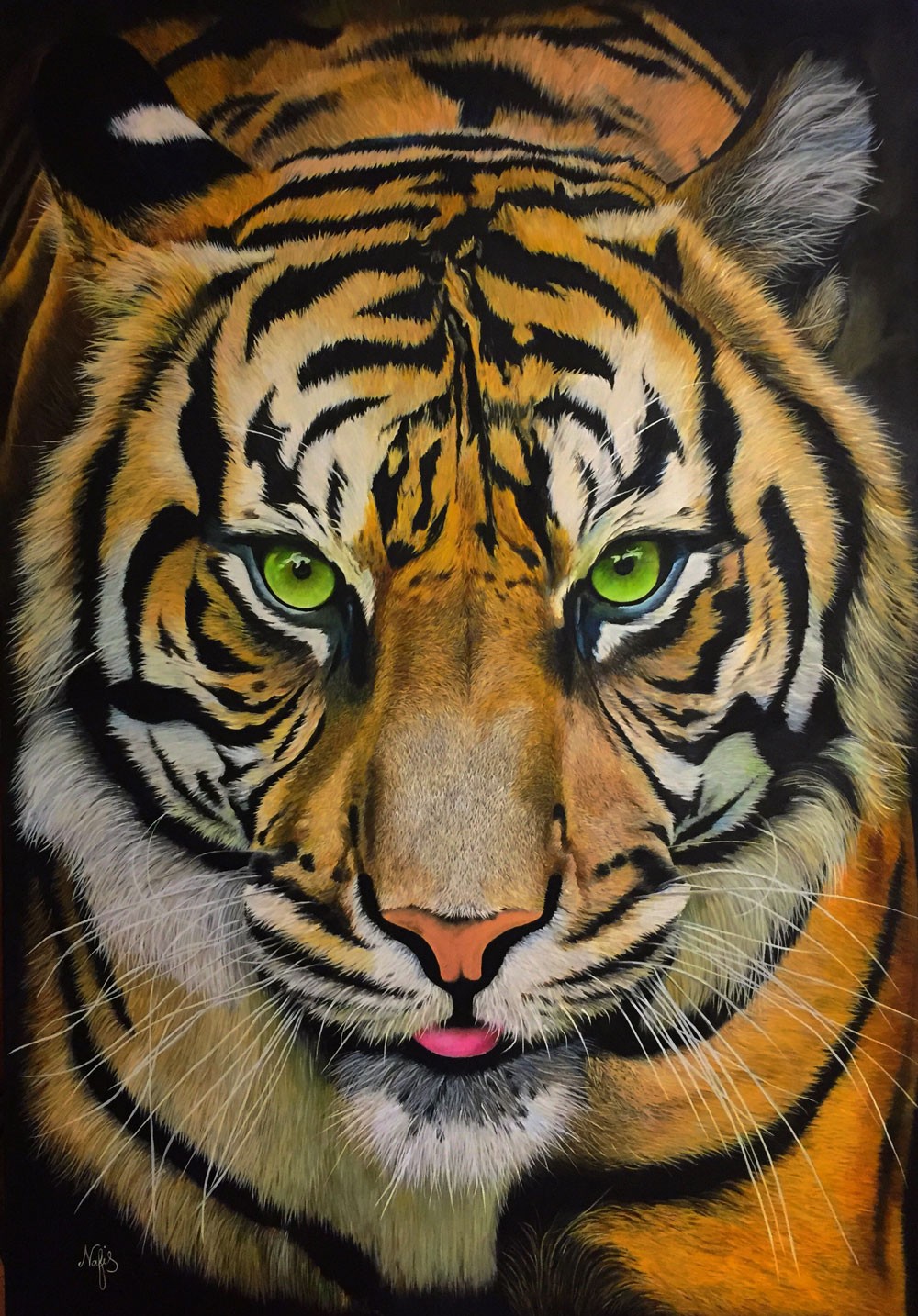 Tier zu malen ist für die meisten Menschen mit vielen starken Emotionen verbunden. Bei einem Tiegerfell sind zarte und weiche Übergänge ganz wichtig. Zuerst habe ich eine dünne Schicht als Grundfarbe gemalt, dann habe ich die nächsten Schichten mit einem sehr dünnen Pinsel übereinander aufgetragen. So habe ich einen imposanten 3-D Effekt erzielt. Refrenzfoto von Gröschl.