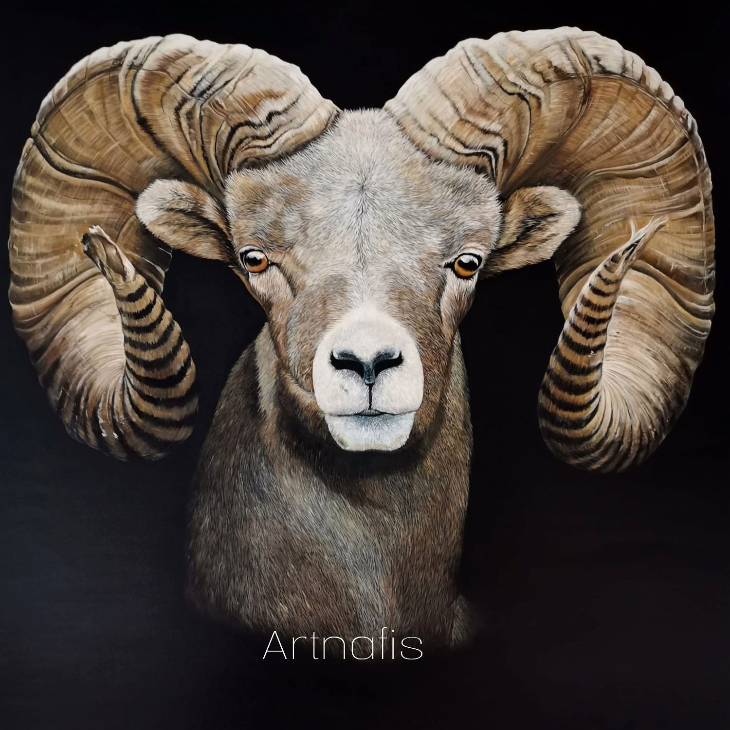 Dickhornschafe kommen im südwestlichen Kanada, den westlichen USA und dem nordwestlichen Mexiko vor. Realismus in der bildenden Kunst ist die Darstellung von Dingen wie im Alltag, ohne zusätzliches Interpretation. Eine Kombination aus braunen, beige und weißen Farben wurde verwendet, um das Horn dieses großen Tieres zu bemalen. Körper und Haut des Tieres werden in fünf Phasen erstellt. Also wurde Schicht bei Schicht gearbeitet.