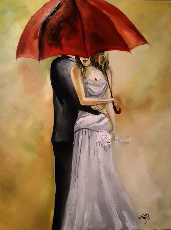 Für den Hintergrund habe ich eine hellbraune Farbe verwendet, damit das weiße Brautkleid gut aussieht. Beim Malen mit Ölfarbe müssen wir die verschiedenen Schichten gemeinsam leicht blenden.