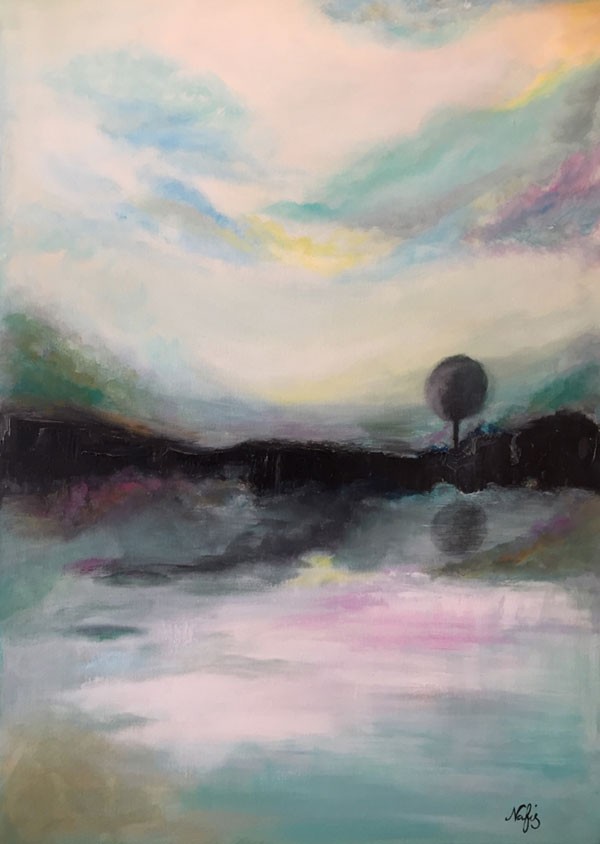 Dies ist ein Originalgemälde mit Acrylfarben auf Leinwand. In den unteren Schichten des Gemäldes wurde verdünnte Acrylfarbe verwendet und dicke Schichten wurden darauf gearbeitet. Verschiedene Farbschichten müssen sorgfältig verwischt werden.
