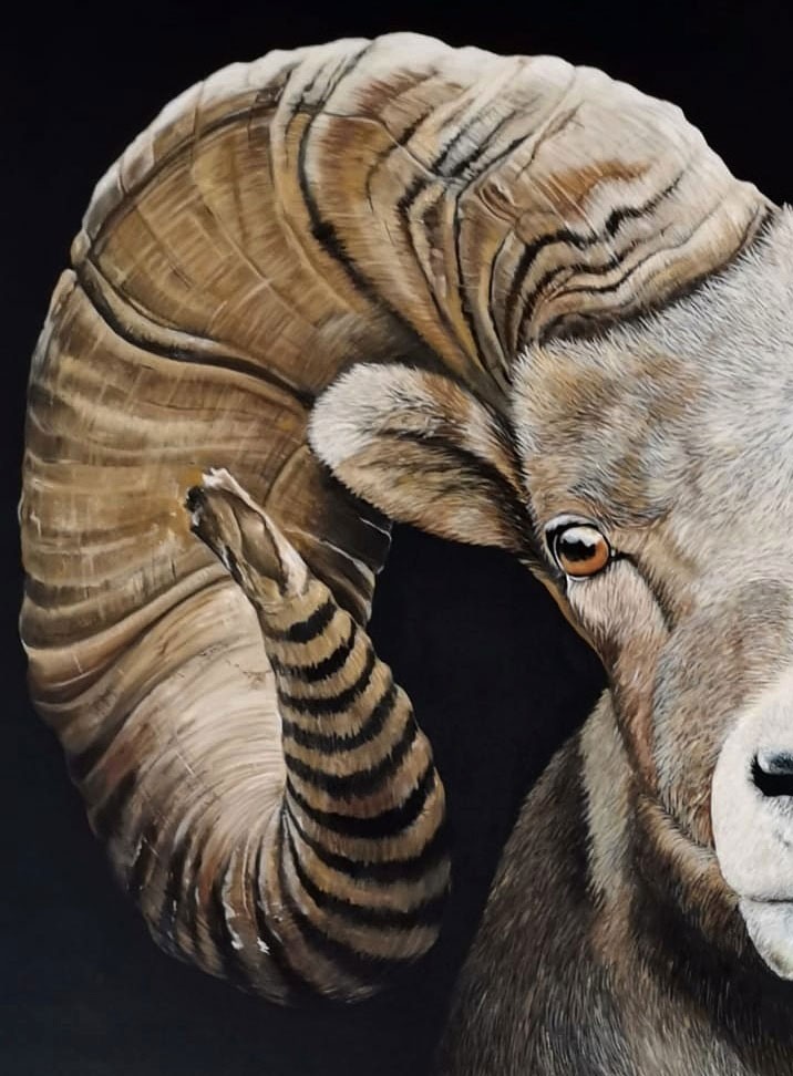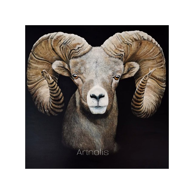 Dickhornschafe kommen im südwestlichen Kanada, den westlichen USA und dem nordwestlichen Mexiko vor. Realismus in der bildenden Kunst ist die Darstellung von Dingen wie im Alltag, ohne zusätzliches Interpretation. Eine Kombination aus braunen, beige und weißen Farben wurde verwendet, um das Horn dieses großen Tieres zu bemalen. Körper und Haut des Tieres werden in fünf Phasen erstellt. Also wurde Schicht bei Schicht gearbeitet.