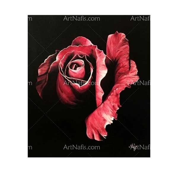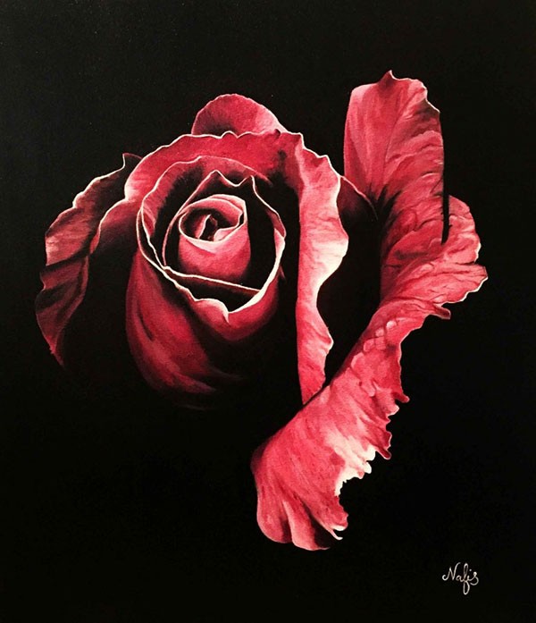 Ich habe dieses originelle Gemälde mit Öl Farben in Rosa, Pink, Rottönen in verschiedenen Schichten gemalt. Von der Grundierung bis zum Firnis ist es allen mit Details aufgetragen. Dieses 3-D Effekt habe ich mit krassen Rosa und ganz viel verwischen dargestellt. Die schwarze Hintergrundfarbe hebt die Blume hervor.