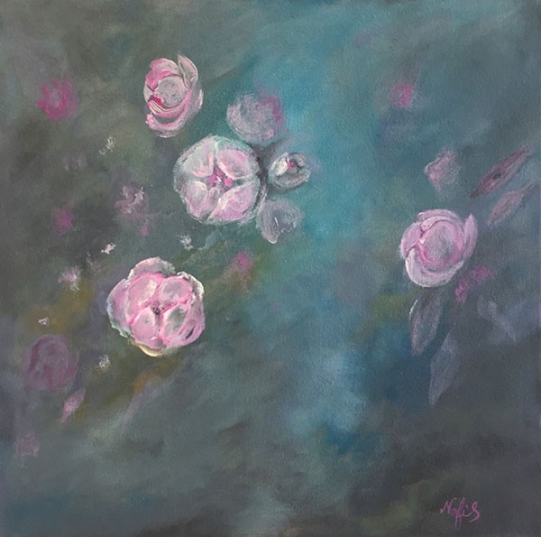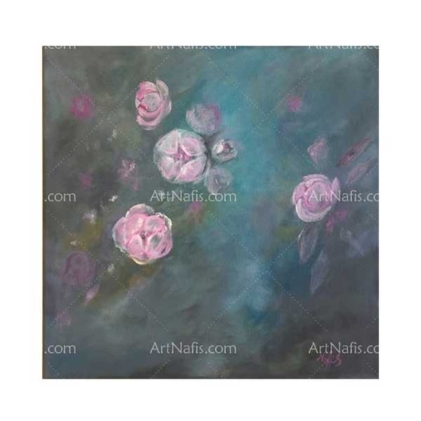 Blumen sind schöne Motive zum Malen. Dieses Gemälde ist mit Acryl gemalt. Im Hintergrund des Gemäldes sehen wir verblassende Blumen und Blätter. Die Farben Grünblau, Ozeanblau, Petrolblau wurden für Hintergrund verwendet.
