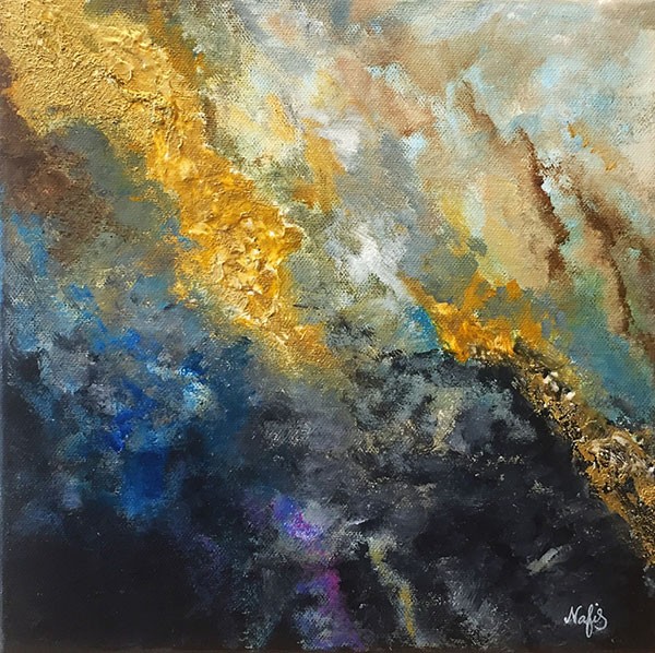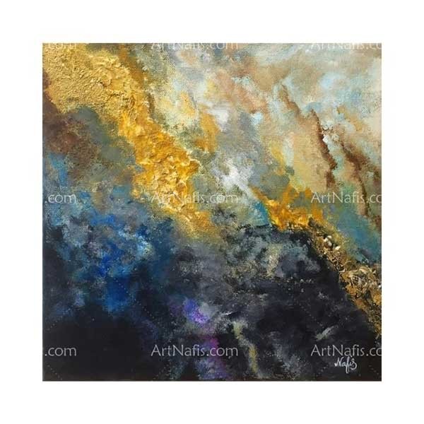 Dies ist ein Originalgemälde mit Acrylfarben in Blau-, Ocker-, Gold- und Schwarztönen, es hat eine schöne strukturierte Oberfläche . Also ist es ein Abstraktemalerei in Mischtechnik.